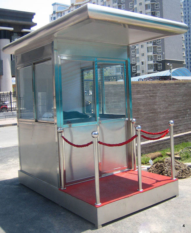 常用规格:1.2*1.5.2.4M 1.5*1.5*2.4M 1.5*1.8*2.4,2.0*2.0*2.4 实际大小,可按客户要求定做 常用材质:不锈钢 铝塑板 铝合金 彩钢板等 产品特点】 标准配置:节能灯、开关、插座、暗敷线路 电话线 工作台等 1、岗亭材质表面经特殊工艺加工处理,精工制作而成,款型别致,品种繁多,美观大方、稳固耐用,适 用于各种通道关卡及停车场。 2、主题骨架采用优质不锈钢整体焊接而成,强度高,抗风压。 3、顶部材料采用特殊防水铰接工艺,彻底解决漏水之患。 4、所有岗亭留有空调及其它电器电源插座,方便使用。可根据您的特殊要求设计制造出不同款式的岗亭