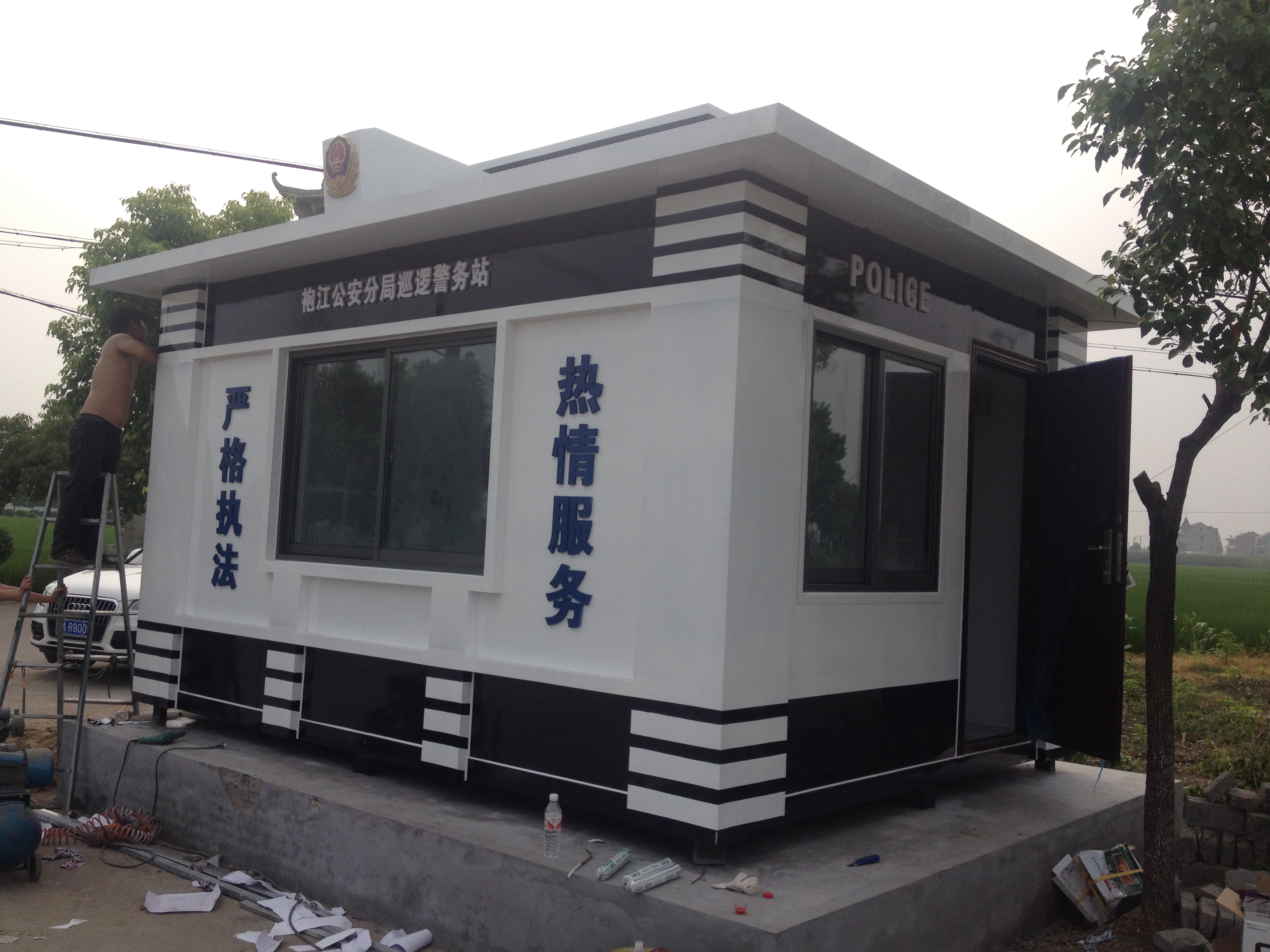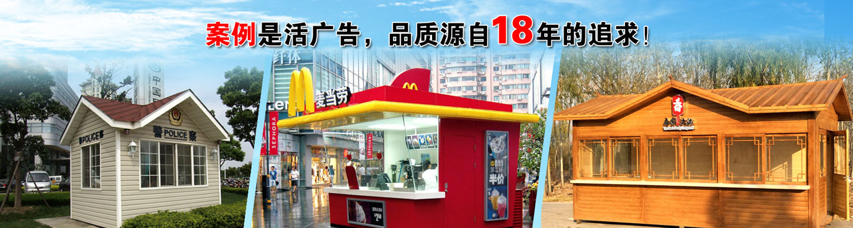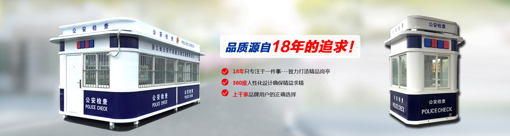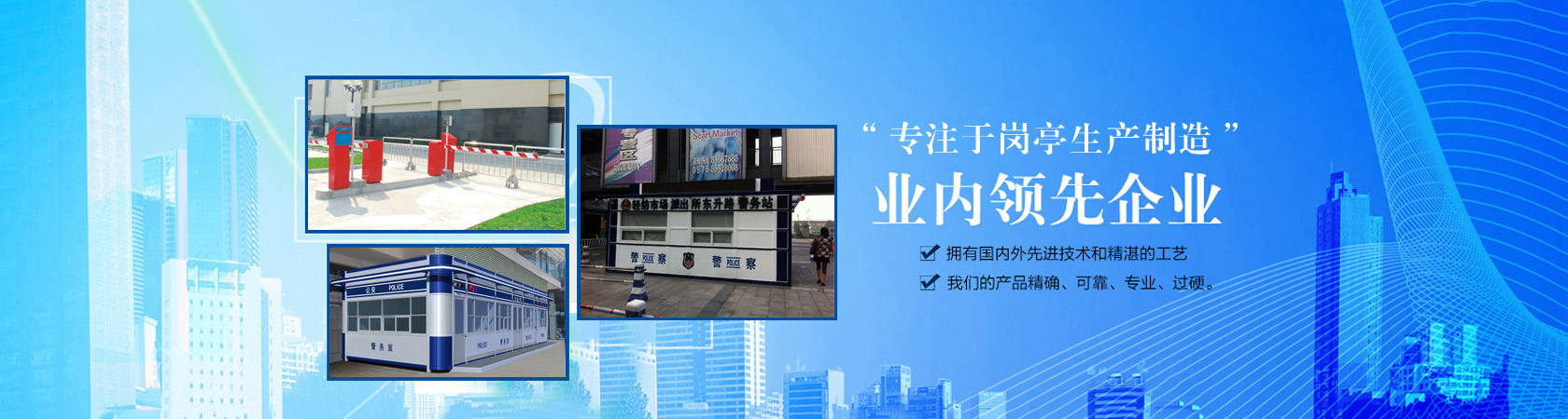 公司主要生产各类岗亭,包括高速公路收费亭系列、治安岗亭、交通岗亭、售货亭、公交亭、书报亭、小区岗亭等,岗亭材质齐全有:不锈钢岗亭、钢结构岗亭、铝塑板岗亭、玻璃岗亭、木制岗亭、金属雕花板岗亭、PVC挂板岗亭等,适用于各政府机关、道路交通、机场港口、地产建筑等多个行业领域。